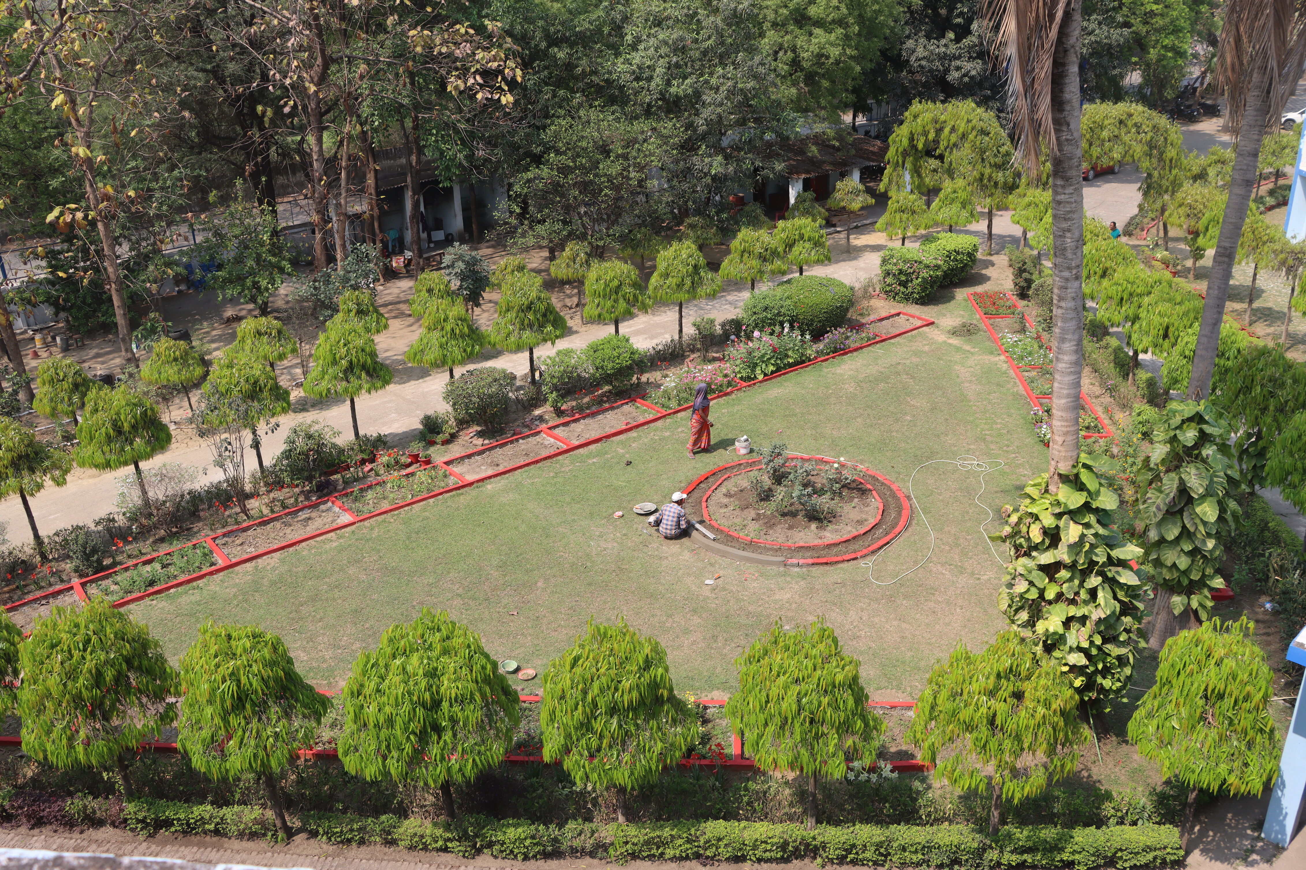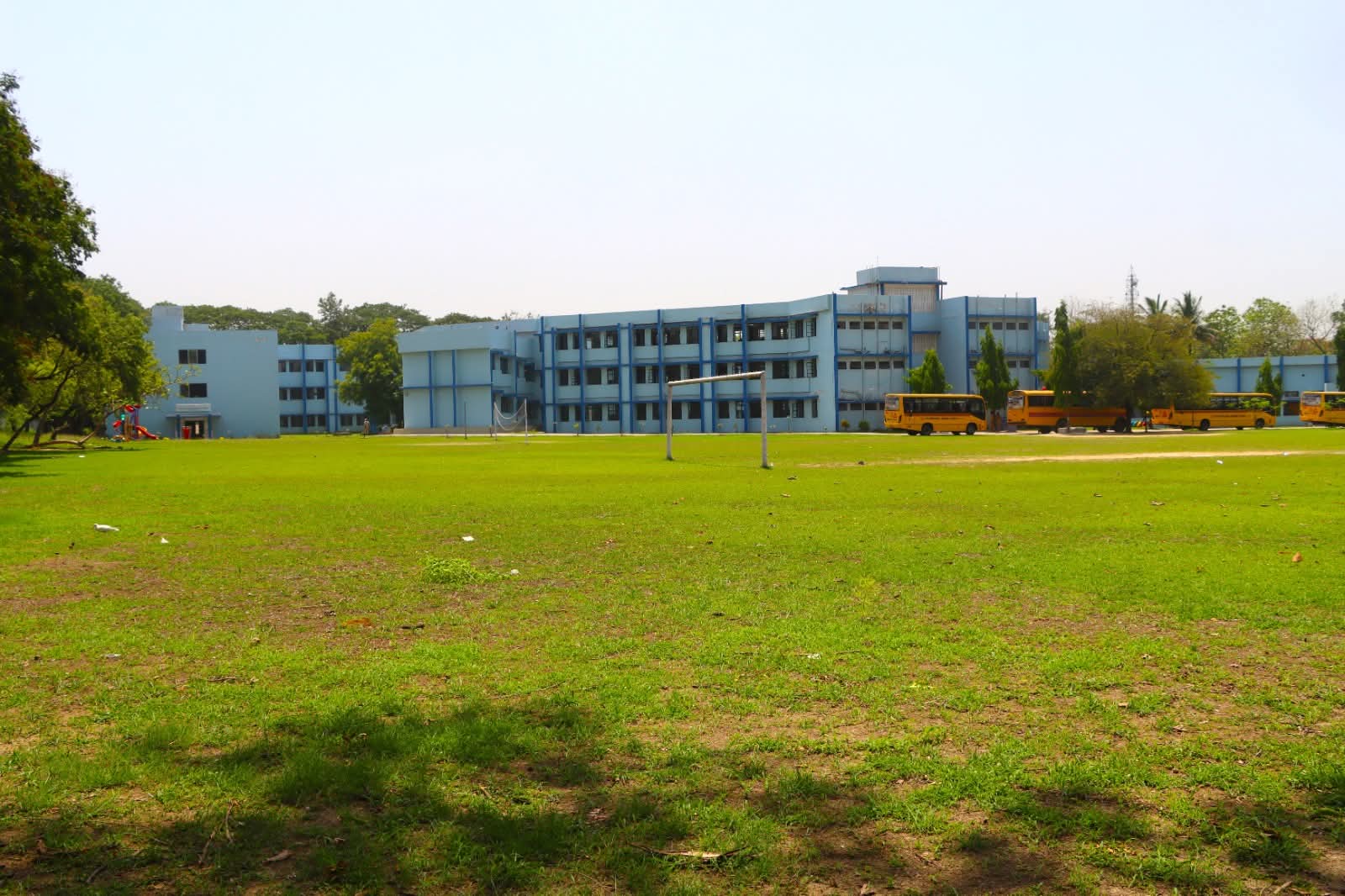 At the center lies a large open stage and field — open to the sky — where the entire school gathers for national celebrations, cultural events, and shared moments of pride.